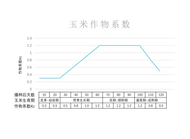利用计算公式,用作物不同生育期的蒸腾蒸发量(ET0)乘以作物系数(Kc),即可得出结果: