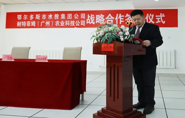 2月14日,鄂尔多斯市水务投资控股集团与耐特菲姆签署战略合作协议。鄂尔多斯市农牧局党组书记、局长乔建江,鄂尔多斯市原农牧局副局长金琦,鄂尔多斯市水利局四级调研员宋春,鄂尔多斯市水投集团党委书记、董事长戴连飞,水投集团常务副总经理、市农投公司董事长杨永华,耐特菲姆中国区总经理聂宗雨,华北大区经理周彦峰,华北业务开发经理顾宣豹,内蒙区域经理连强出席签约大会,水投集团相关部门负责人及耐特菲姆公司相关人员参加会议。