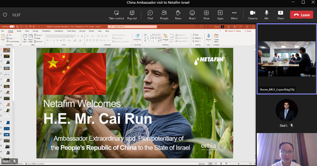 耐特菲姆中国区总经理聂宗雨通过视频连线加入和蔡大使团队的的座谈会。聂宗雨介绍了耐特菲姆在中国的发展历程以及耐特菲姆在精准滴灌技术在中国的推广过程中扮演的特殊角色。聂宗雨总经理还介绍了耐特菲姆在中国的经营情况,特别介绍了耐特菲姆在推动中国水肥一体化技术发展以及在部分重要省区参与政府高标准农田建设所作出的努力。蔡大使对耐特菲姆在和中方合作的过程中做出的努力和贡献表示高度认可,希望耐特菲姆在节水灌溉,数字农业,高标准农田建设等方面继续加强和中方的合作。蔡大使也表示会全力支持和帮助耐特菲姆在中国的合作和发展,希望耐特菲姆在中国农业现代化进程中继续发挥重要作用。
